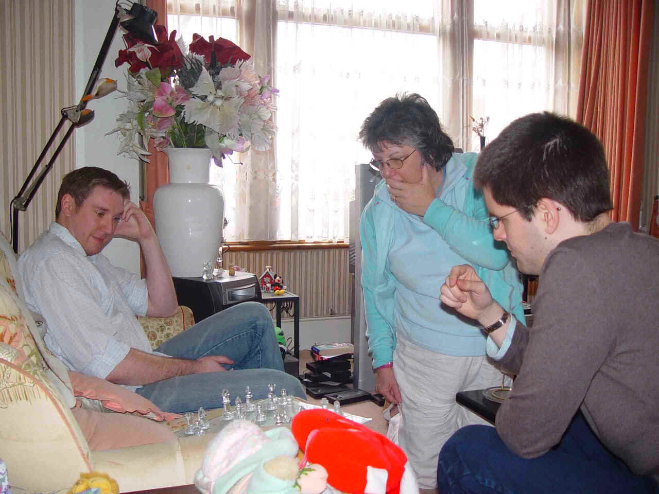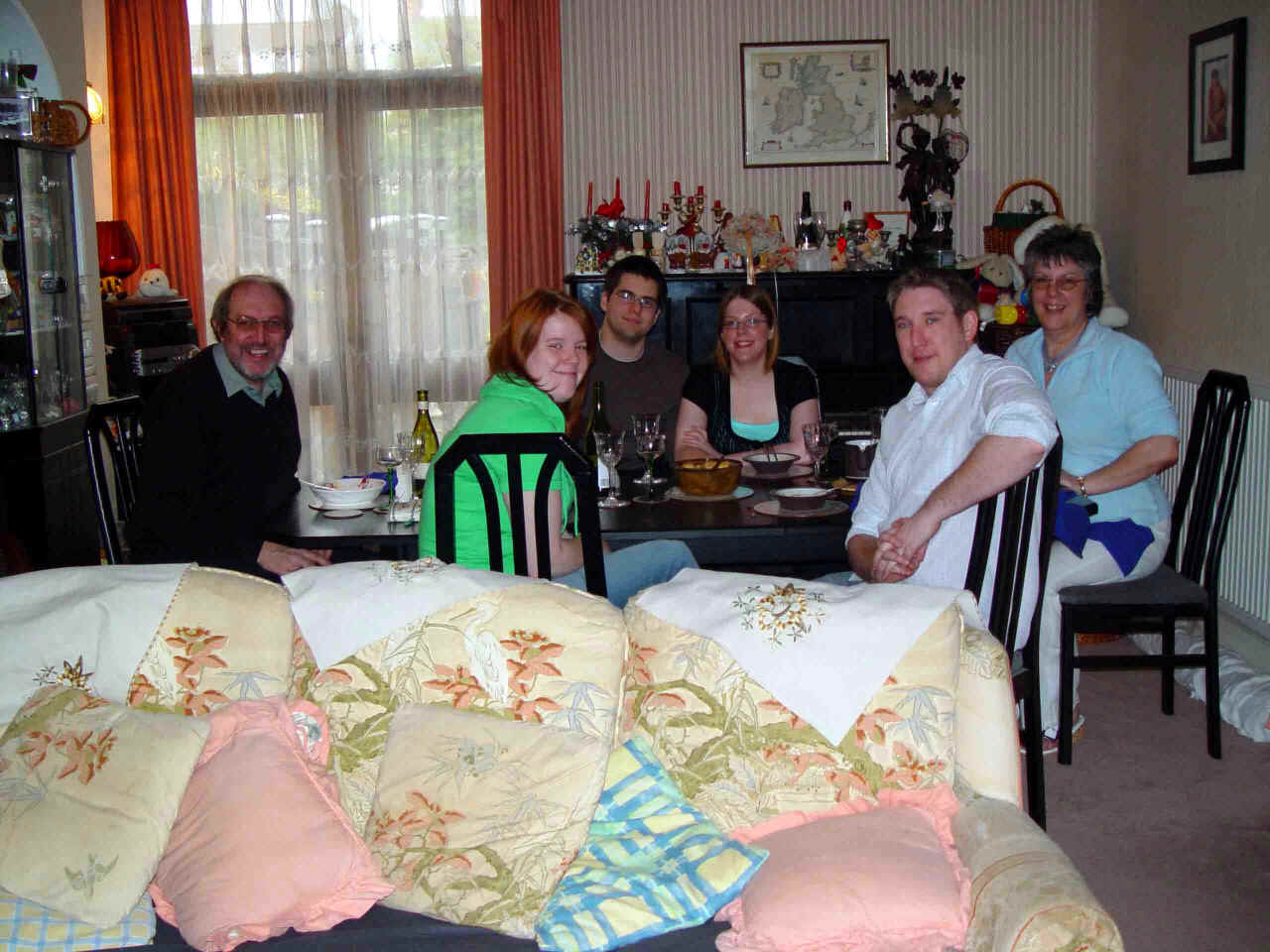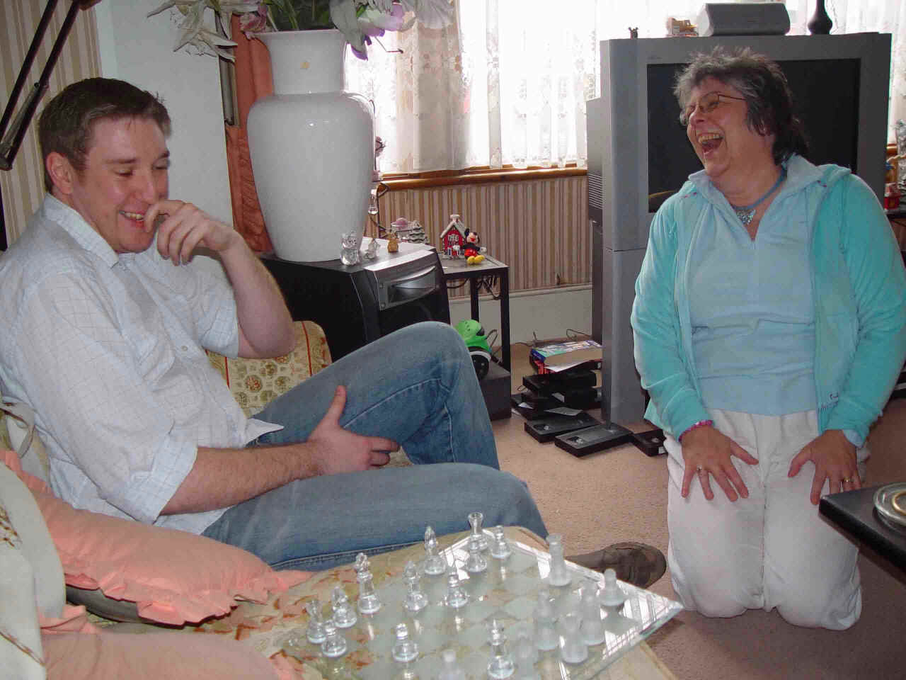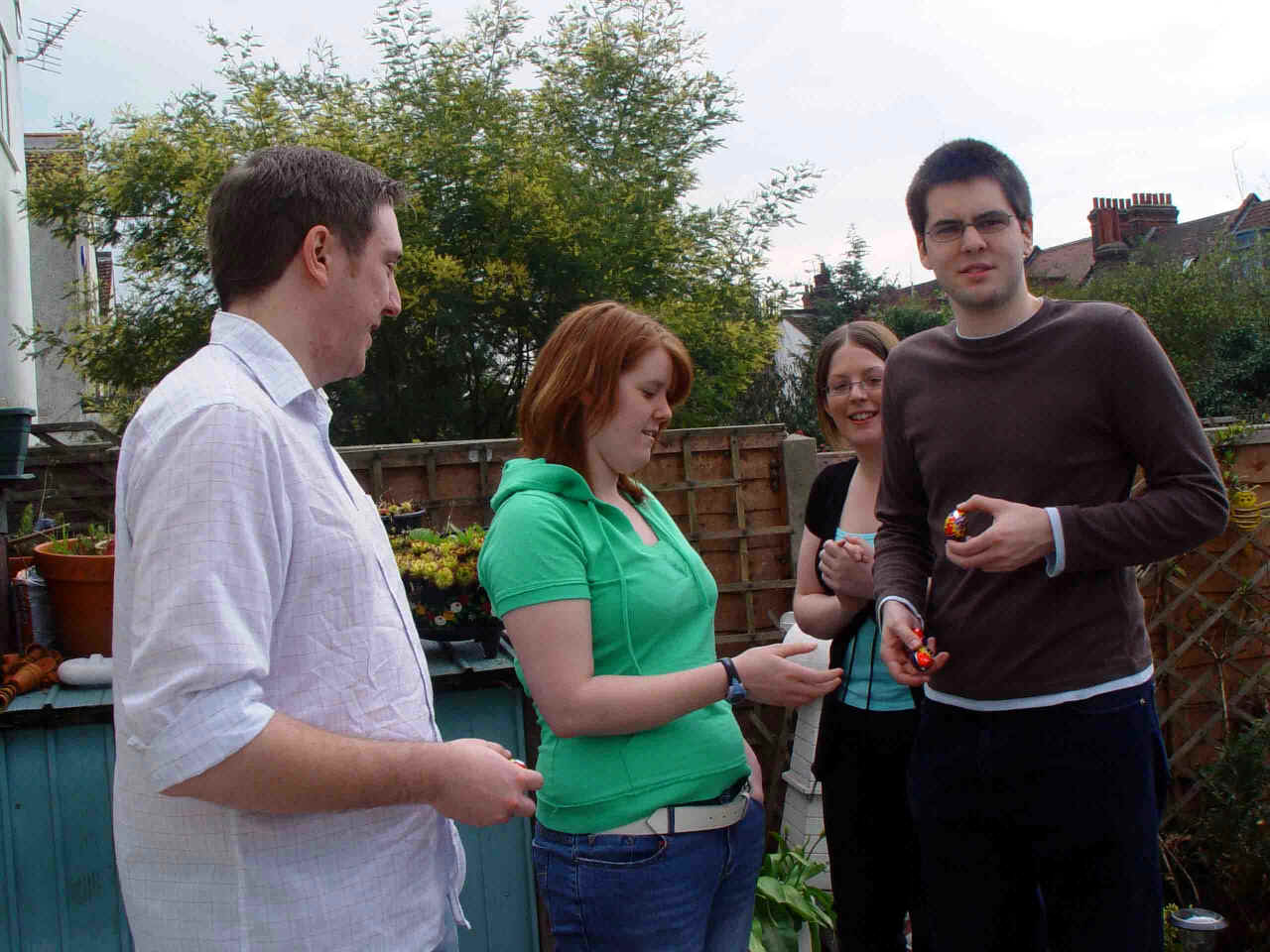 The great Easter Egg Hunt in the garden Yes, they found some eggs John, Naomi, James, Dawn, Mark, Sue after lunch The girls having fun Naomi pleased to be home for Easter James and Mark play chess Sue enjoying the game Time for a nice glass of port