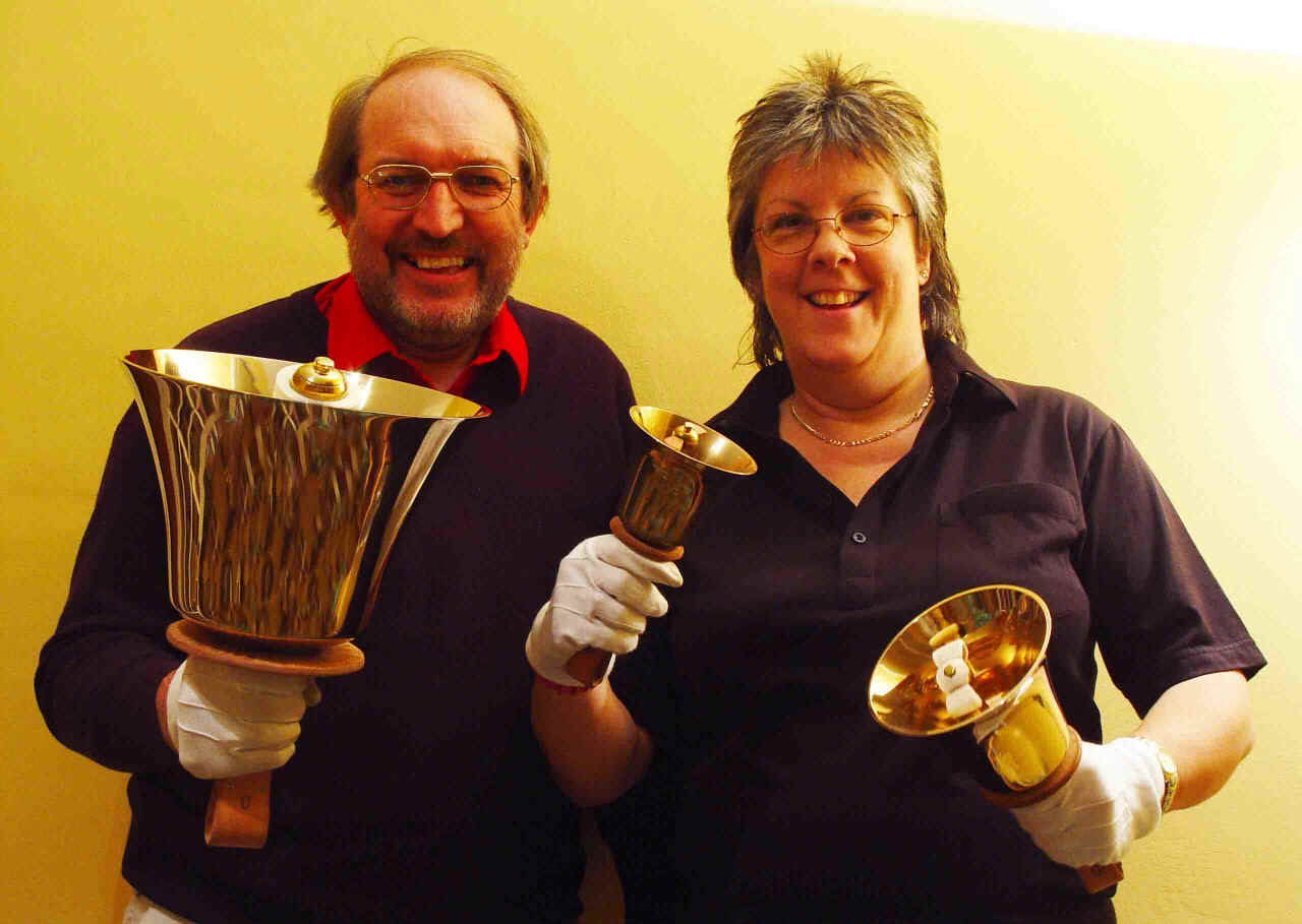 | John and Sue with the Sound in Brass Musical Handbell Team 2004 |