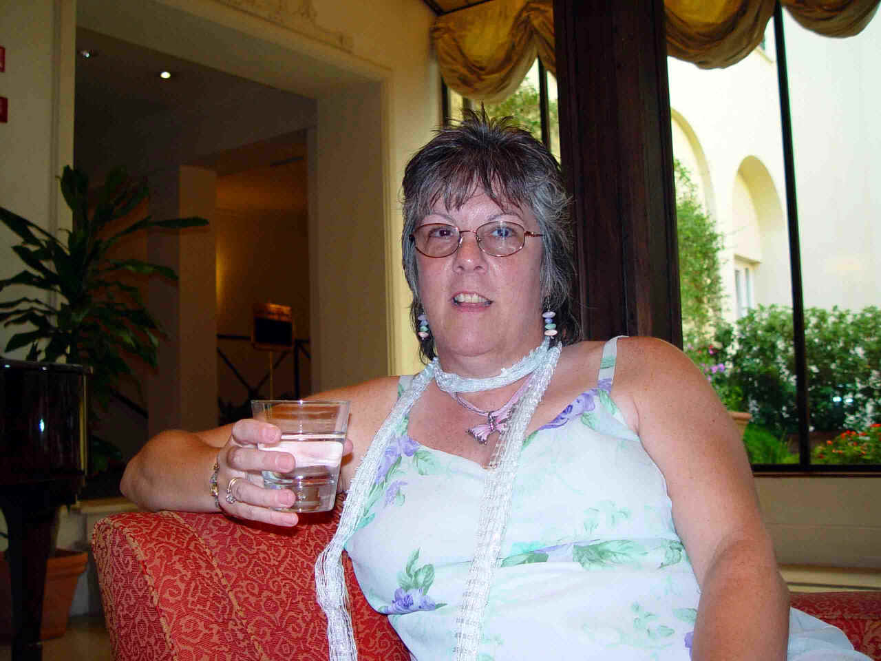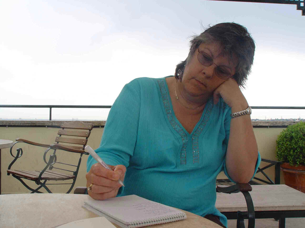 Singer at meal at Pagnanelli's Sue in reflective mood on the roof garden of the hotel in Rome