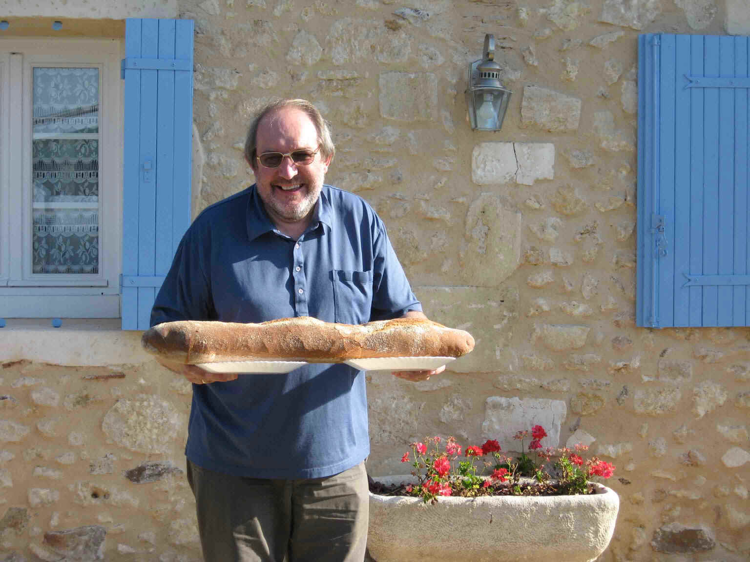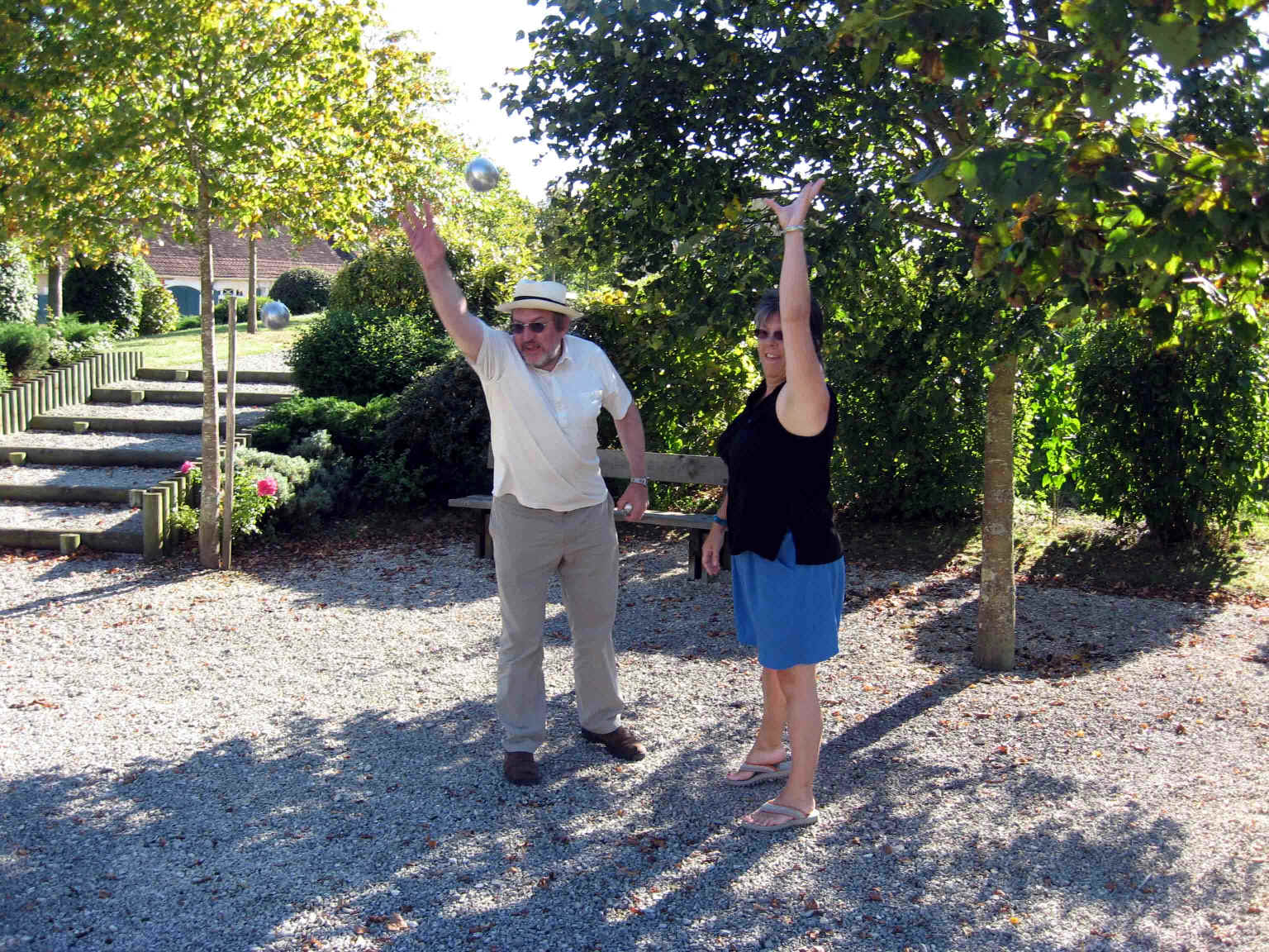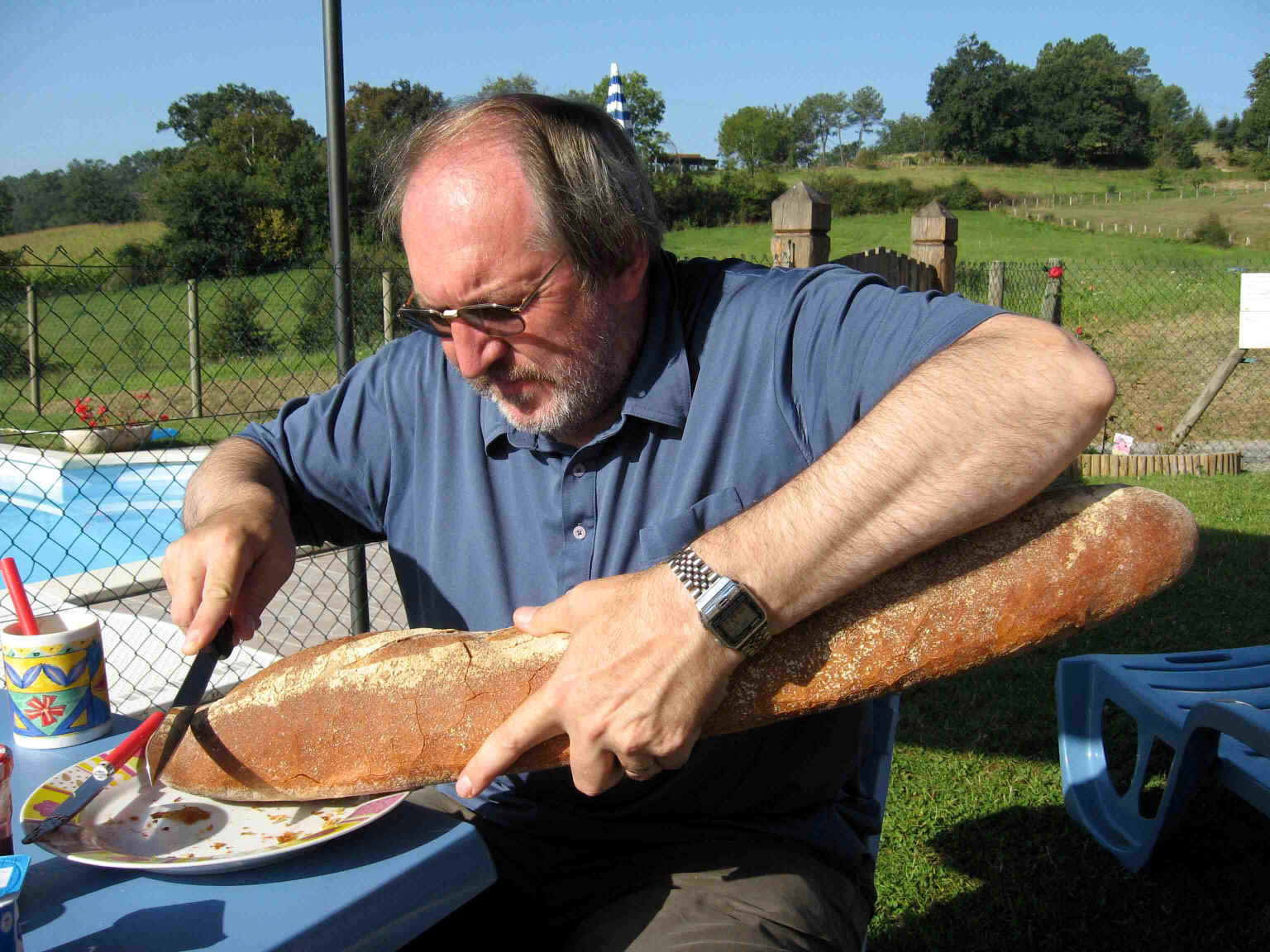 Now this is what you call a loaf of bread Two plates required plus............................... A large knife John taking it easy at the restaurant in Laveyssière Sue in the pool again - this time with a glass of wine! John and Sue at La Force after lunch Sue in Bergerac The quayside in Bergerac Mark and John in Bergerac The three of us having dinner at the restaurant in Laveyssière With Nicolas and Carole at Le Jardin d'Ecluses restaurant at Laveyssière Relaxing at the cottage England versus Australia at Table Tennis A game of pétanque Spot the balls