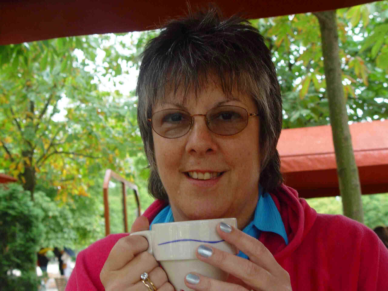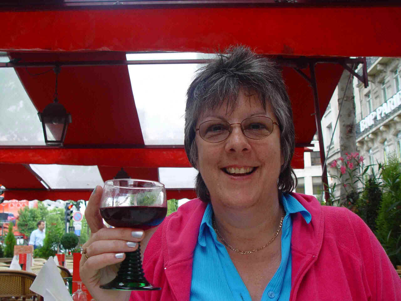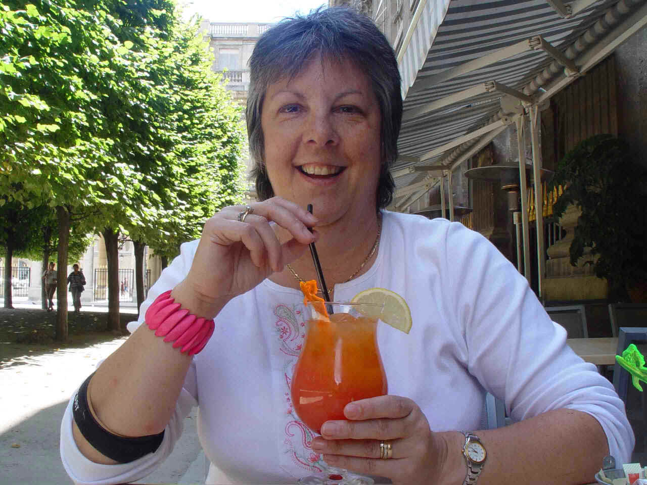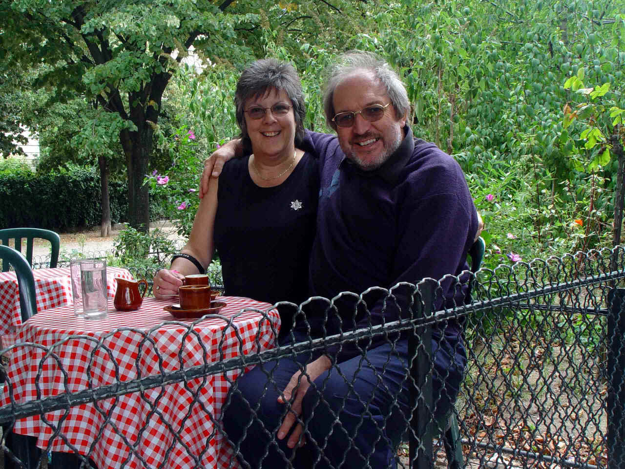 At the Tuileries Taking shelter with a cup of tea after a rainstorm Our wedding anniversary meal in the Champs Elysée Sue enjoying her wine in the Champs Elysée More refreshment - a nice quiet garden area near the Eiffel Tower Summer in Paris Our last day - lunch on a boat What drink has she got now?