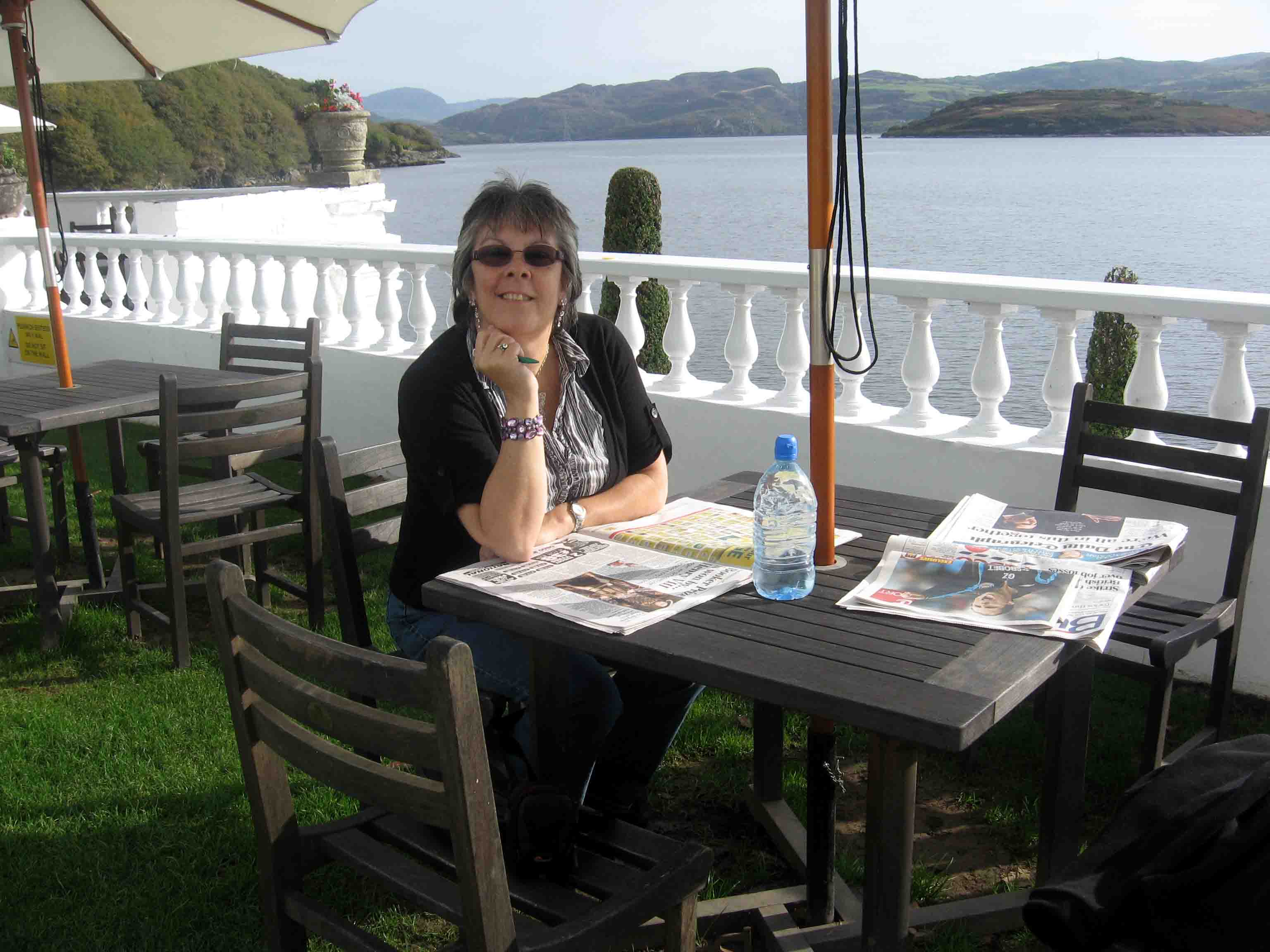 View at breakfast in the hotel Sue relaxing on the patio outside the hotel