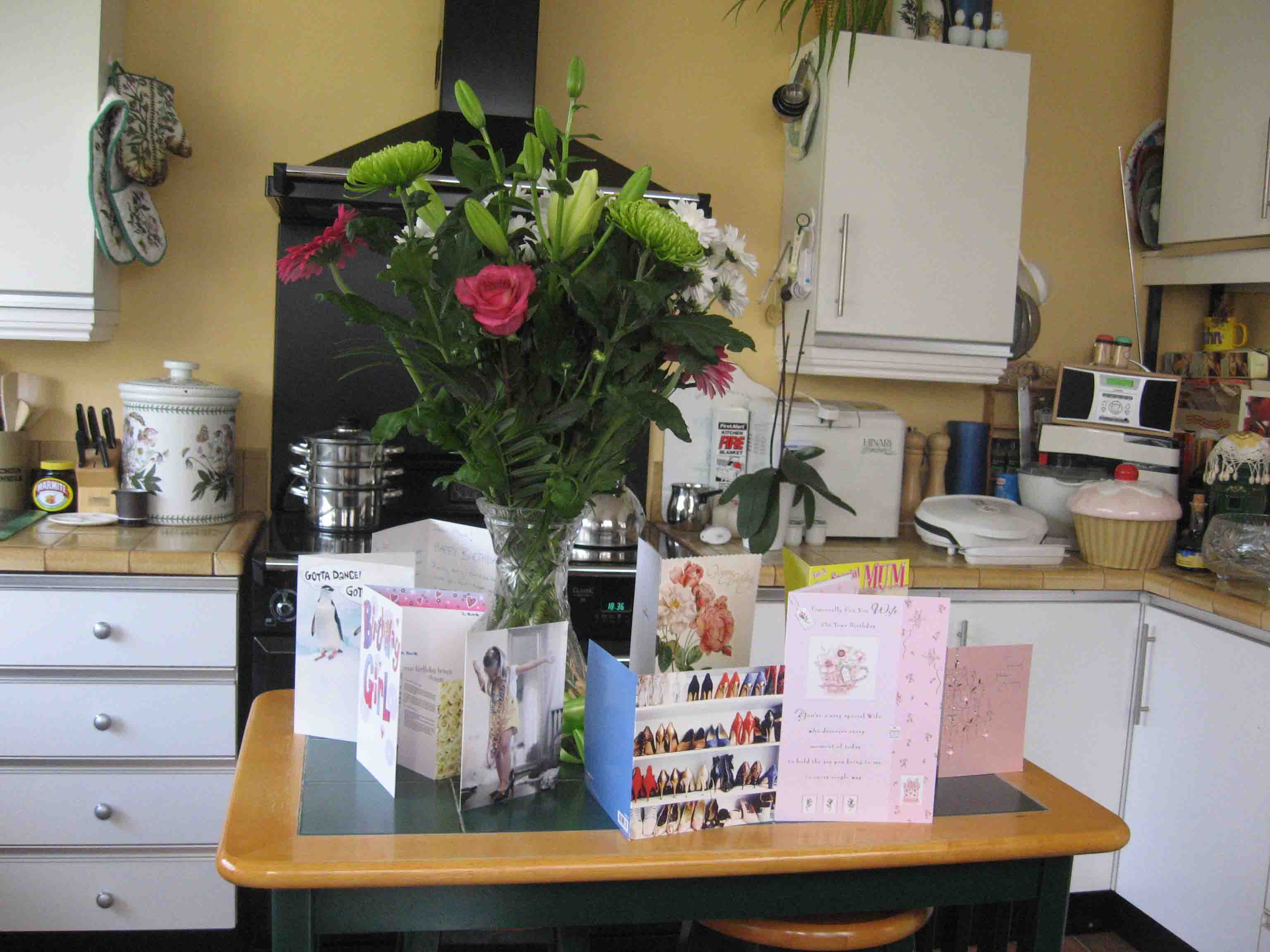 Card from James Present from James Lunch at Bella Italia With John, James and Dawn Afternoon cake and tea in the garden Afternoon cake and tea in the yard (to keep the Americans happy) Dinner being cooked by John The roast is served Cards and flowers John and Sue relaxing at the end of the day